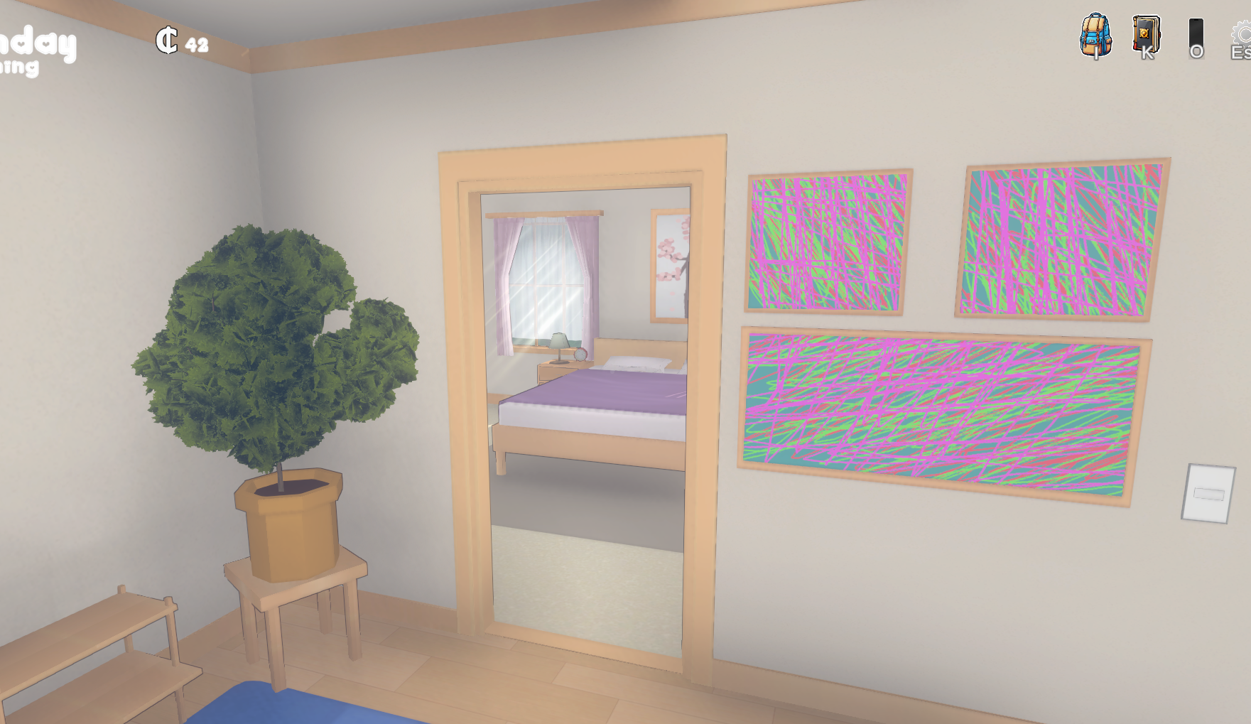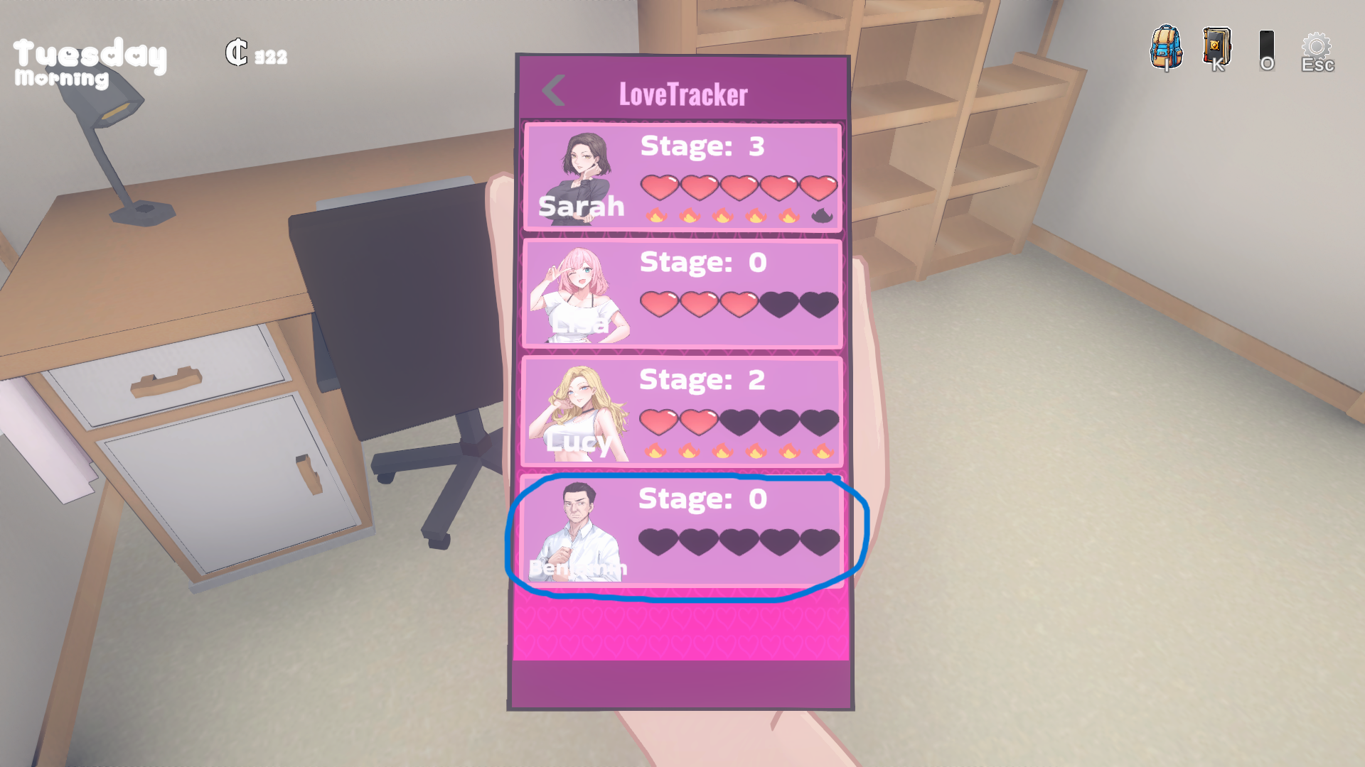 And this is more of a personal issue with the game, but I have some issues with the UI. The hotkeys for these things is one thing, O for phone and K for tasks is a choice, but what I'm more annoyed by is the task instructions. It's always "Let's wait until friday". "Let's go wait in your room." Like some guy recording a let's play, or someone trying to teach a child what to do. It's just jarring, and there's nothing wrong with a simple imperative like "go to your room", so why take this tone?