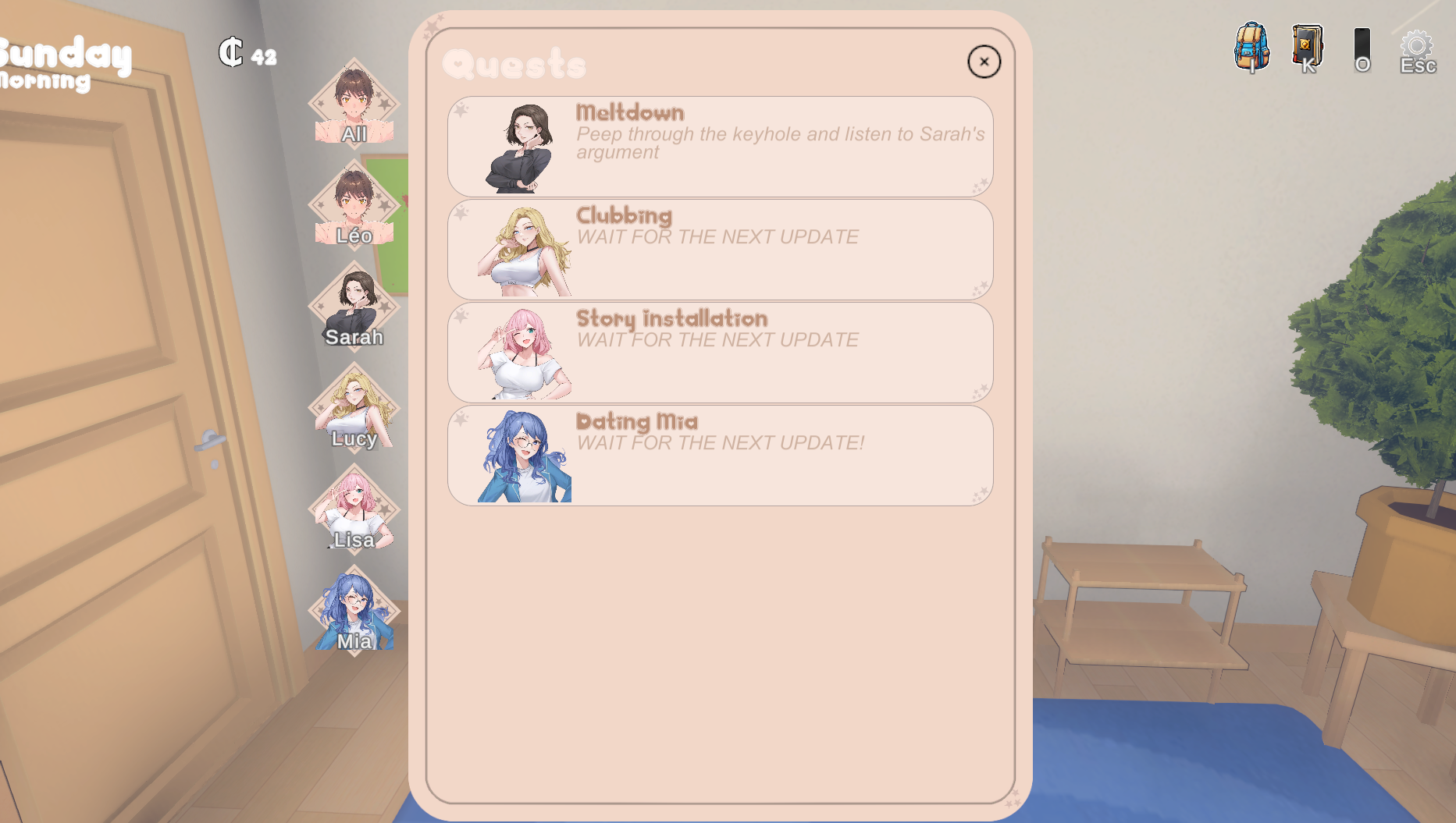Hey so, i downloaded the new update and i cant progress in the story. like i got the DnD speaker, but thats it, theres nothing else for me to do, it says wait for the next update on that quest, and then all of the other quests dont have any new instructions as well, my only options are work, or walk around or sleep. please let me know a fix ASAP because im on windows and ive tried reinstalling, ive tried making a new save, all of that.
