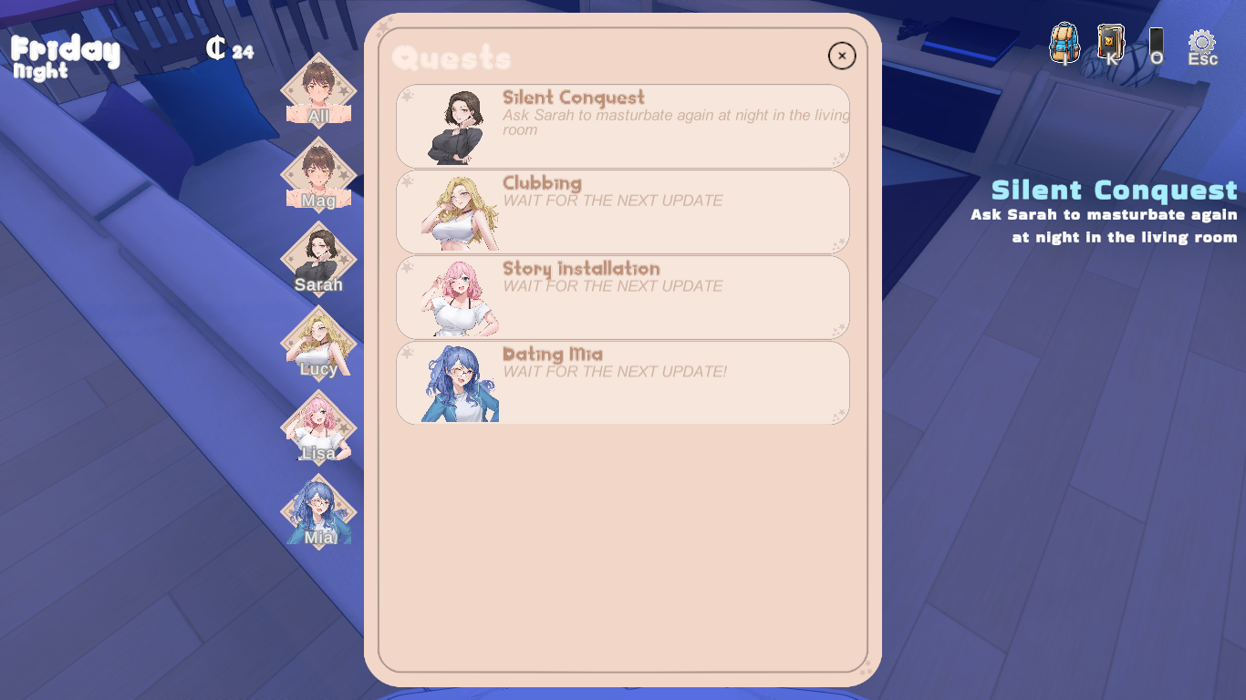 A bug I found is that I got stuck in the gym after working all day then going to the gym in the evening and working out made it night and I had to talk to Sarah for a quest. The game thinks i was in the house and it soft locked me in the gym.